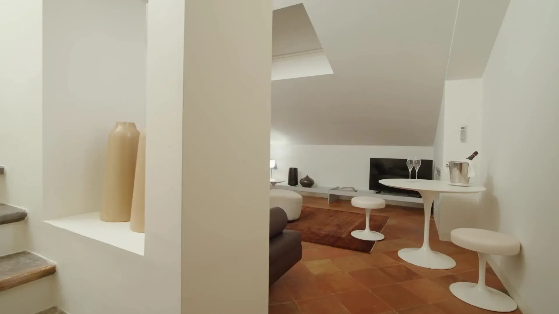 Suite su due livelli (con pochi gradini interni). Soggiorno al piano inferiore e camera da letto e bagno al piano superiore. Dispone di un elegante bagno open space con doppia doccia. Archi in mattoni e autentiche pareti in pietra risalenti al 1200 creano l’atmosfera suggestiva di questa suite di 50 m² con vista sulla Rocca Maggiore e sulle colline che circondano Assisi (senza balcone).