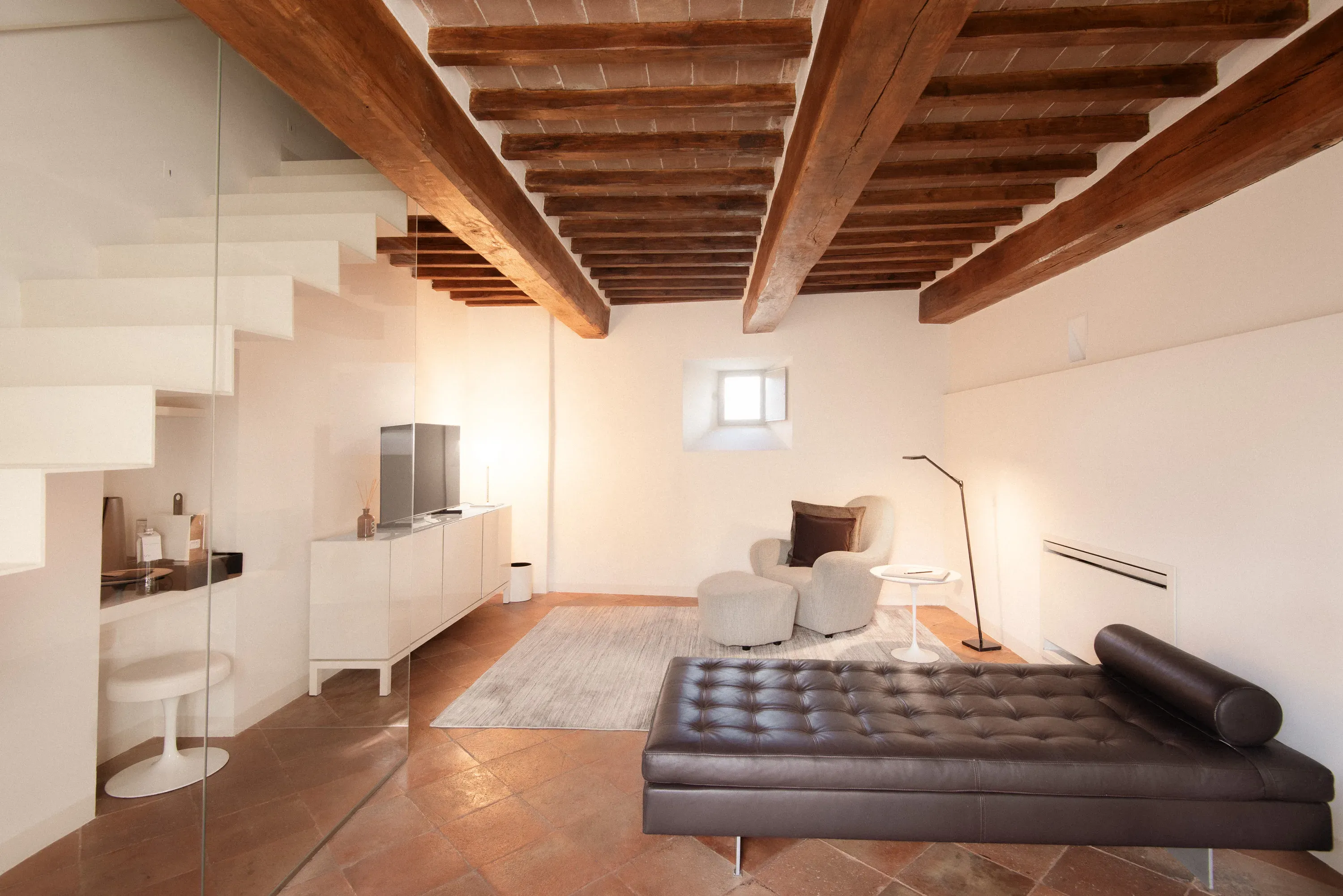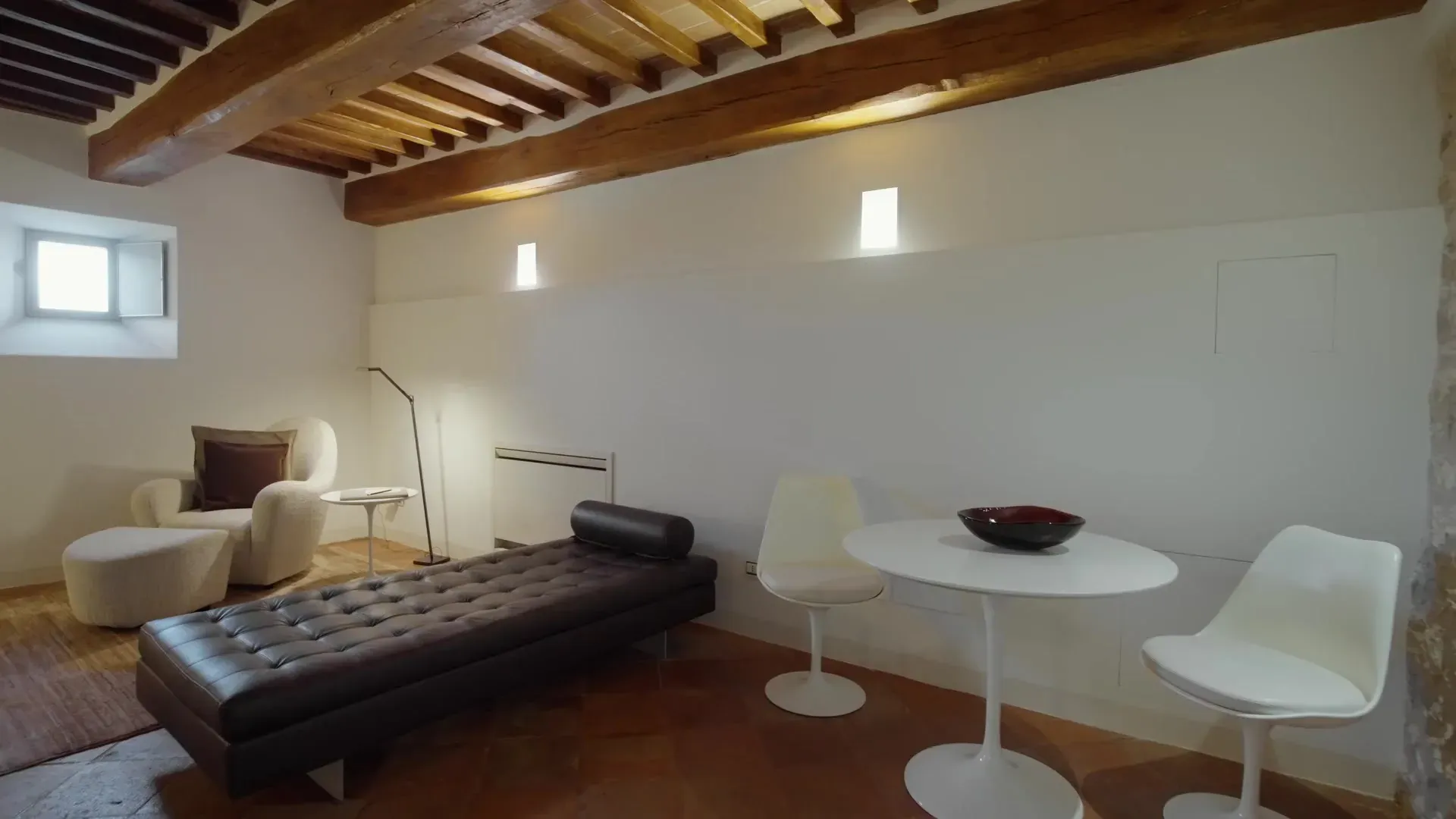 Suite su due livelli (con pochi gradini interni). Soggiorno al piano inferiore e camera da letto e bagno al piano superiore. Dispone di un elegante bagno open space con doppia doccia. Archi in mattoni e autentiche pareti in pietra risalenti al 1200 creano l’atmosfera suggestiva di questa suite di 50 m² con vista sulla Rocca Maggiore e sulle colline che circondano Assisi (senza balcone).